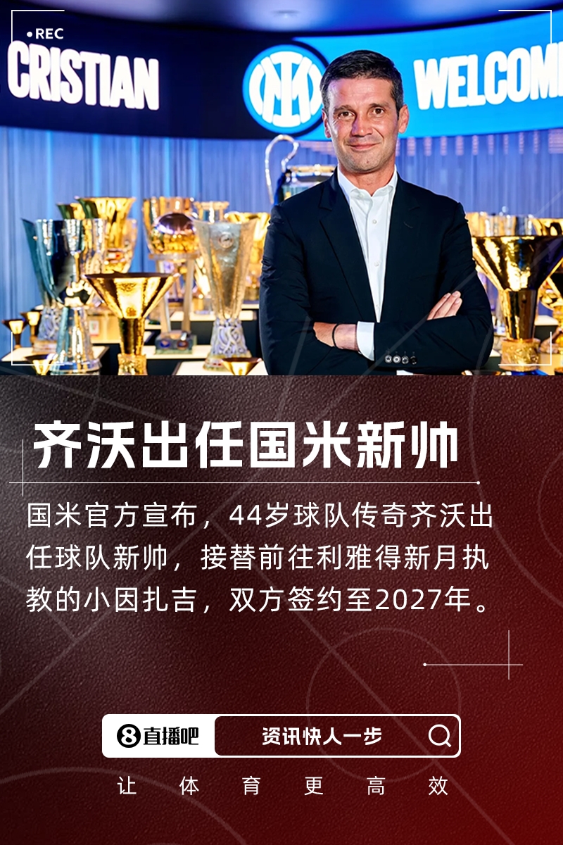 接替小因扎吉!国米官方:44岁名宿齐沃出任球队新帅,签约2年